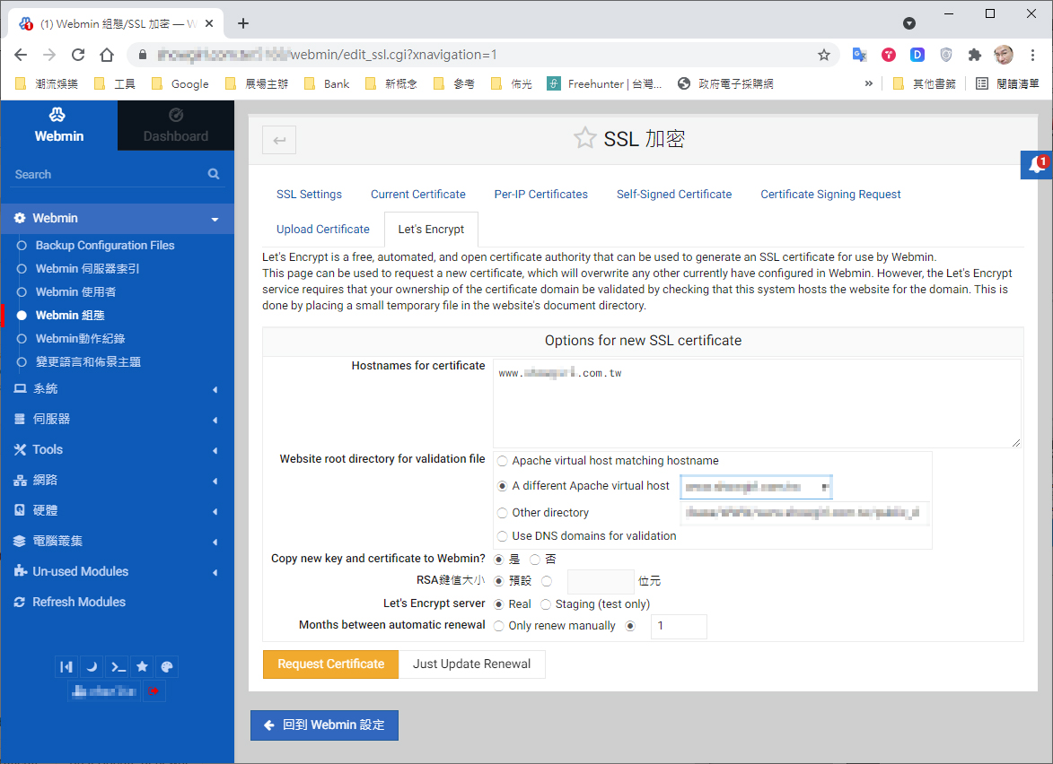 首先就是進到 webmin → webmin 組態 → SSL加密 → Let's Encrypt 這頁,然後設定你要用來認證的域名或IP(Hostnames for certificate),然後勾選 A different Apache virtual host,其他的任選。