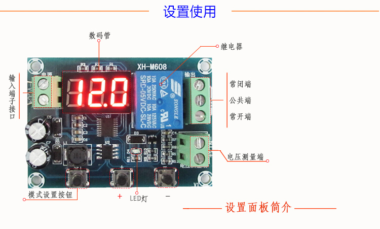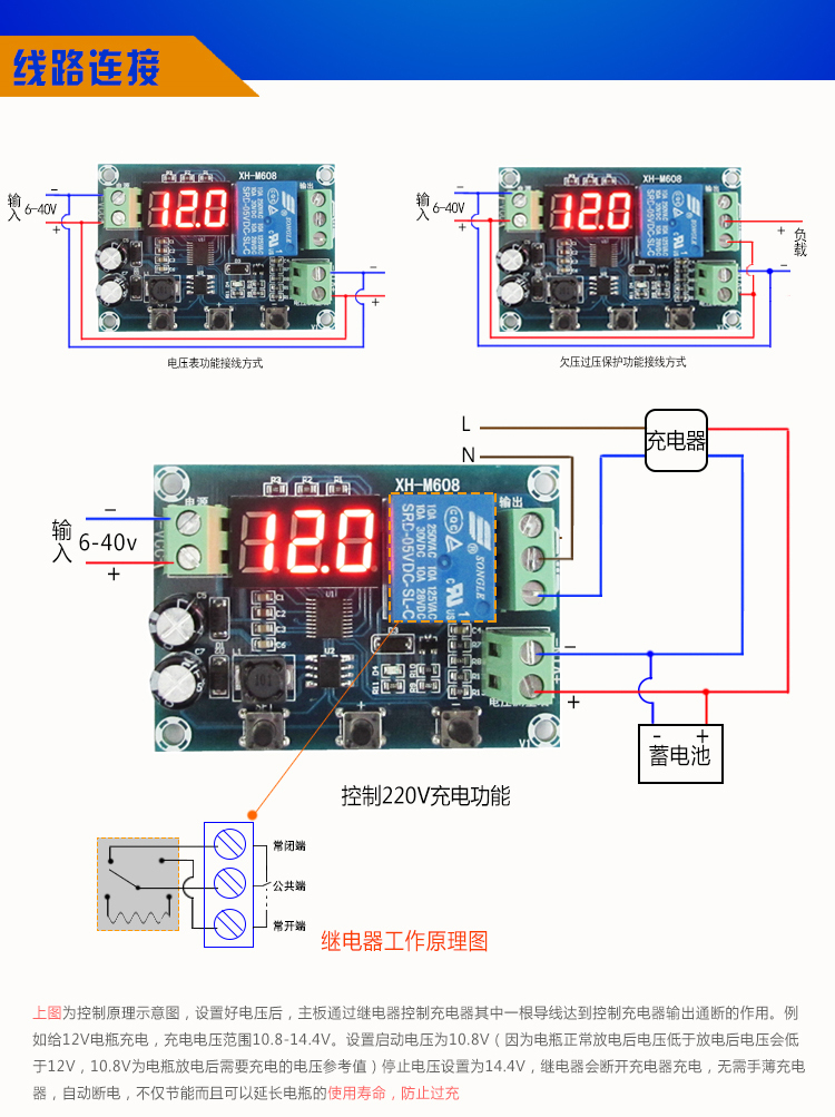 下限电压<=检测电压<=上限电压 继电器闭合;其余电压 继电器断开
