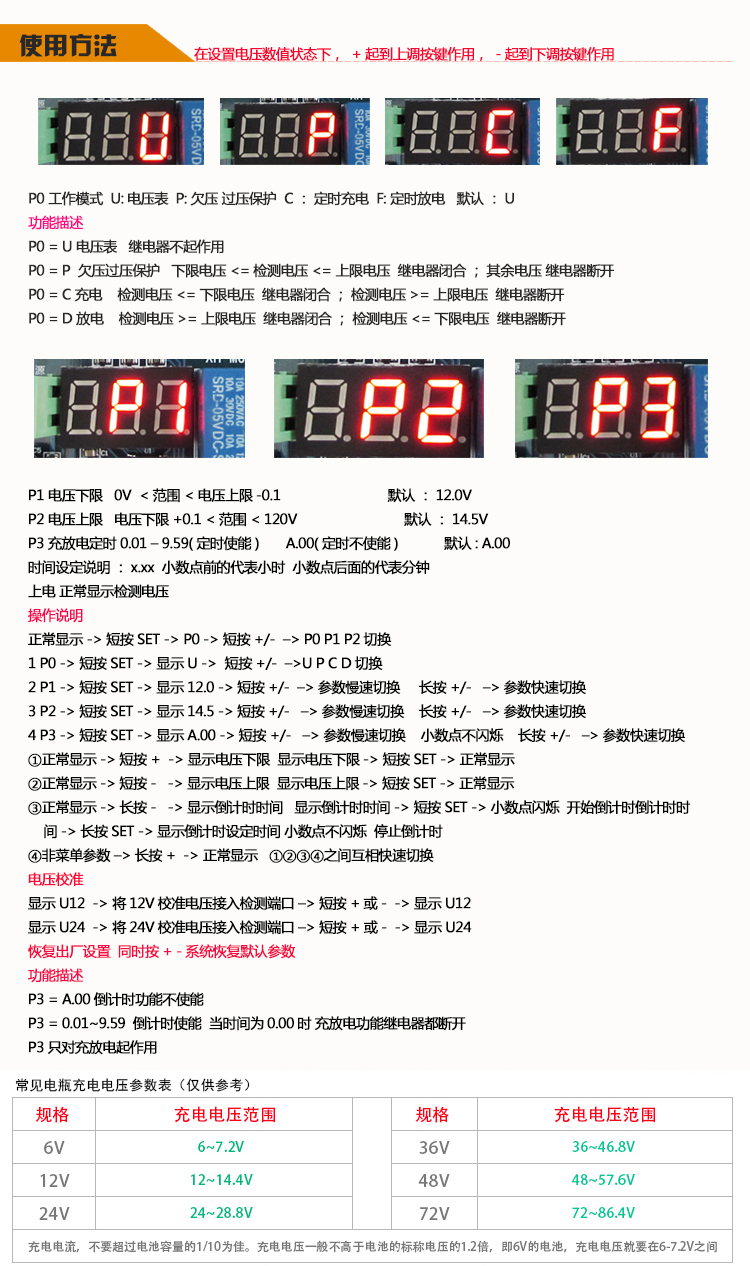 P0工作模式 U:电压表 P:欠压 过压保护 C:定时充电 F:定时放电 默认:U